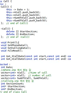 P7 Calling 날짜마다, 몇분 통화했는지, 몇번 통화했는지 하는 자료가 있다. 그 자료를 토대로, 날짜 구간을 주면 통화량, 통화횟수를 출력하는 프로그램이다. 입력 받는 파일은 2가지로, 하나(phone.inp)는 날짜에따른 정보들이 들어있고, 하나의 파일(calling.inp)에는 날짜 구간이 들어있다. 출력 파일(calling.out)은 하나다. 전체적인 구조는 Call Class 를 만들어 사용했다. 개념은 단순하기 때문에 여기서 더 설명할 건 없을 것 같다. main()함수의 안에는 최대한 간결하게 했다. 간결하다. 객체 선언후 파일을 읽고 프린트를 해준다. 함수의 이름과 기능이 다소 맞지 않은 것 같은데 이점은 좀더 보완 해야 할 것 같다. 다음은 클래스 멤버함수들이다. 더욱 간결하게 짤려고 했는데 더 복잡해.. 2012. 10. 1. strlen(), strcpy() 구현 간단하다. strlen 의 경우, 단순히 문자열의 끝은 NULL 이니 NULL 이 나올때까지 찾았다. cpy 경우도 간단하다. 크기 측정후에, 하나하나 넣어주고, 끝에 NULL만 넣었다. 2012. 8. 29. 비속어찾기 프로그램 #include #include using namespace std; bool isTermofAbuse(string str) { if( 0 2012. 8. 29. 이전 1 2 다음